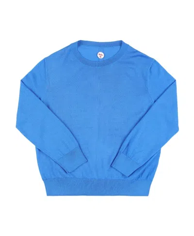 Light blue round-neck knitted pullover, round neck, long sleeves, ribbed collar, cuffs and hem.