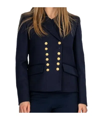 Double-breasted closure, two front flap pockets, pointed lapels, embossed gold-tone buttons.
