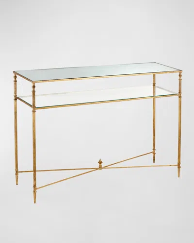 Handcrafted console. Made of iron with antiqued goldpainted finish. Reinforced mirror top. Tempered glass gallery shelf. Slender profile makes console perfect for narrow hallways and entryways. 45"W x 14"D x 33"T. Imported. Boxed weight, approximately 80 lbs.