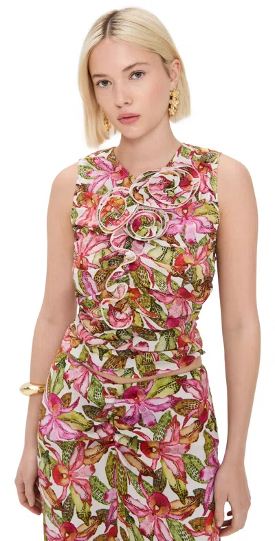 Fabric: Lightweight, non-stretch textured weave. Floral print and allover ruching. Ruffle detail and floral applique at front. Crew neck. Sleeveless. Button keyhole and zip at back. Shell: 82% rayon/18% nylon. Lined. Lining: 100% cotton. Dry clean. Imported, China. Measurements: Measurements from size S Length: 17.75in / 45.0cm, from shoulder