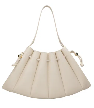 - Vegan material - Crescent motif mounted with semi-rigid and wavy bands - Interior zippered pouch - Adjustable and removable shoulder strap: height 95- 110cm, additional holes possible - Drawstring top closure with pendants on the sides - Dimensions: H 19cm W 28cm D 5cm - Made in Italy