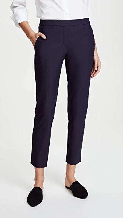 Classic Theory pants in a slim silhouette. Slant front pockets. Covered elastic waist. Faux fly. Fabric: Stretch suiting Faux fly Cropped profile Covered elastic waist Slant front pockets Shell: 52% cotton/39% nylon/9% elastane Dry clean Made in the USA Imported fabric Measurements Measurements from size 4 Rise: 9in / 23cm Inseam: 27in / 68.5cm Leg opening: 12in / 30.5cm