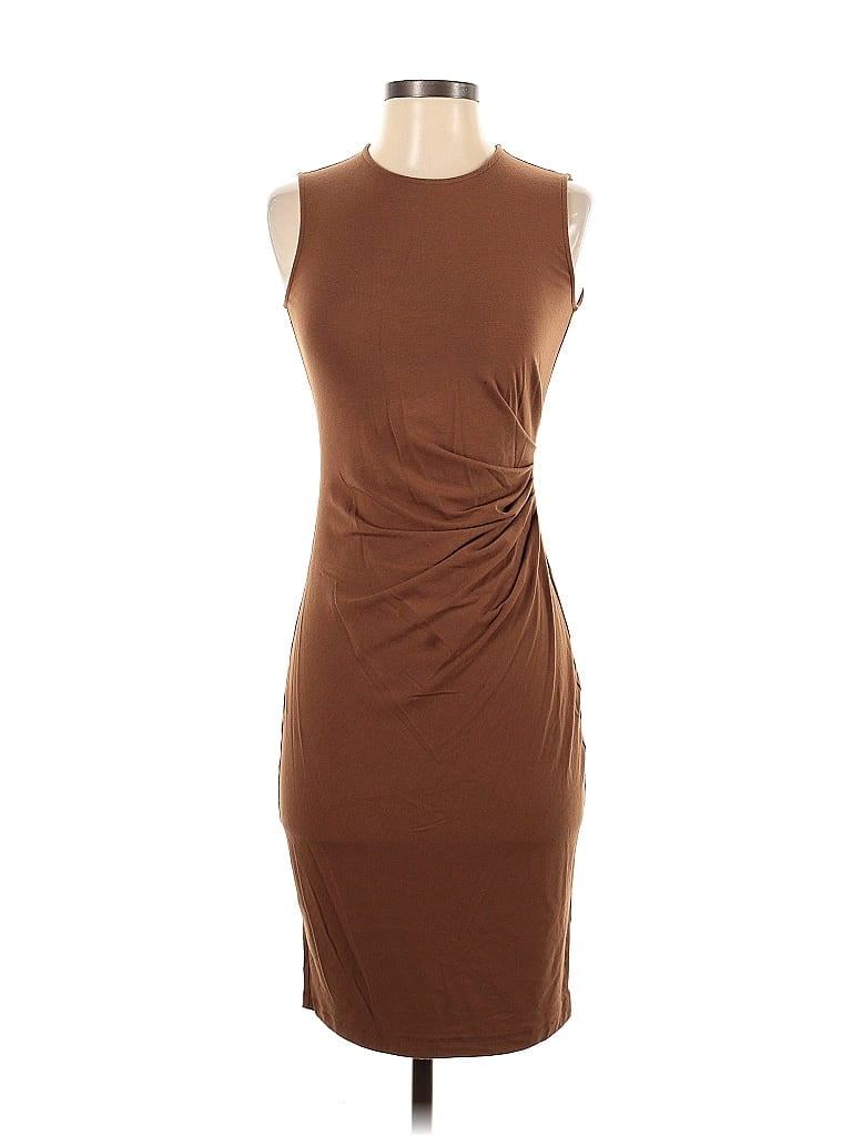 Theory Casual Dress, Size: P. Item Details: Brown, Solid Pattern, Sheath, Crew Neck, Knee Length, Sleeveless, Ruched, Women's Dresses, Modal/Pima Cotton/Spandex