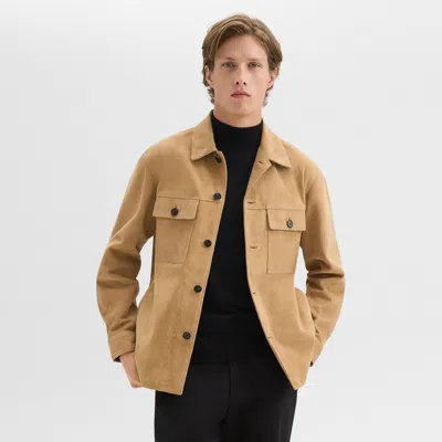 Introducing the Theory Closson Suede Jacket in New Camel. This stylish outerwear piece from the renowned brand Theory is expertly tailored and designed to make you look and feel great. Made from 100% lamb leather, this jacket features button cuffs, front chest pockets, and a button front closure. The pocketing is made of 100% cupro for added luxury. With a length of approximately 27 inches from shoulder to hem, this jacket is versatile and easy to wear. The model is 6'2 and is wearing a size medium, but measurements may vary slightly by size. Clean by a leather specialist, this imported jacket is a must-have for any fashionable man's wardrobe. Upgrade your style with the Theory Closson Suede Jacket today!