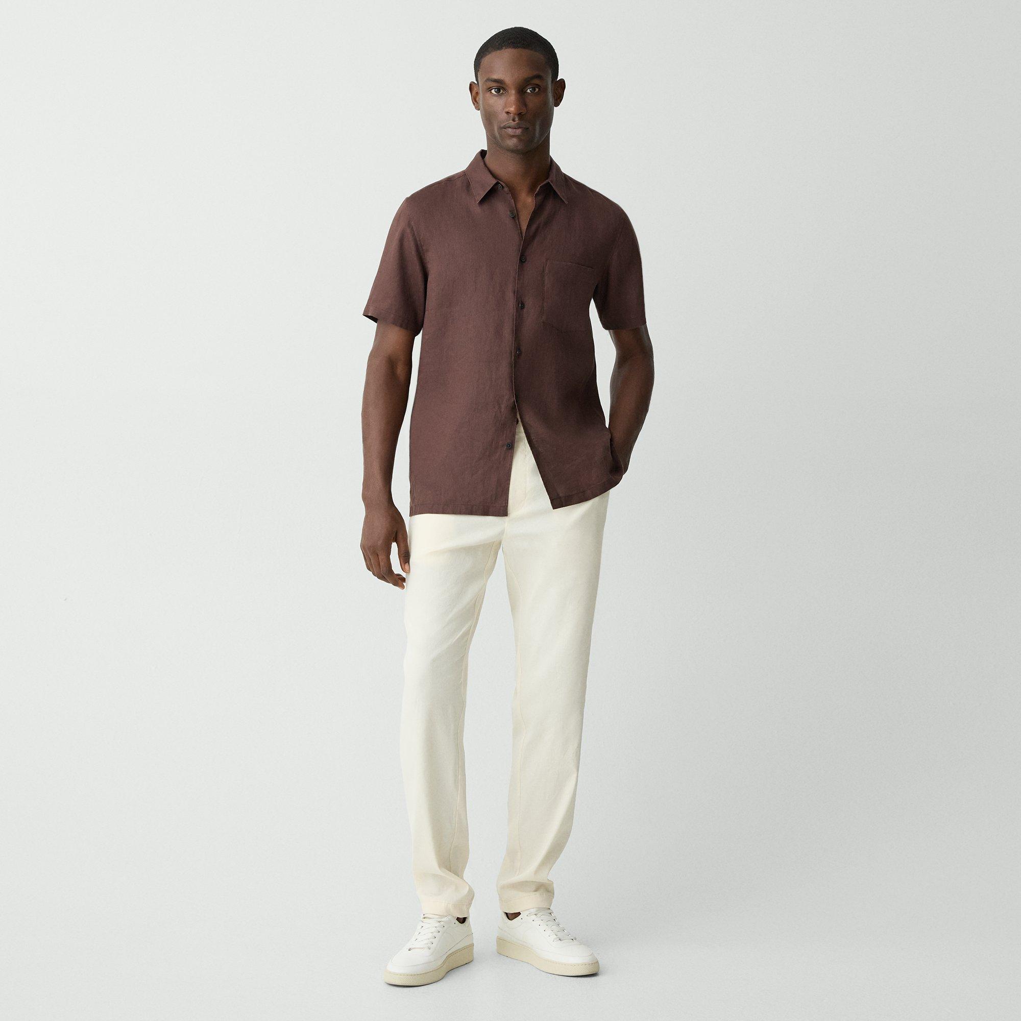 Introducing the Theory Zaine Eco Crunch Linen-Blend Pant, a stylish and versatile addition to any man's wardrobe. Made by the renowned brand Theory, known for their commitment to developing innovative fabrics and functional pieces, these pants are sure to make you look and feel great. The Zaine Eco Crunch Linen-Blend Pant comes in a classic sand color with belt loops and four-pocket styling for added convenience. The inseam measures approximately 32 inches, and the pants feature a zip fly with slide tab closure for easy wear. Constructed from a blend of 62% linen, 36% viscose, and 2% elastane, these pants are both comfortable and stylish. The model is 6'0 and is wearing a size 32, but measurements may vary slightly by size. For a polished and sophisticated look, pair these pants with a crisp button-down shirt or a sleek blazer. Whether you're heading to the office or a special event, the Theory Zaine Eco Crunch Linen-Blend Pant is a versatile choice that will elevate your style. Don't miss out on this must-have piece, imported and available now.