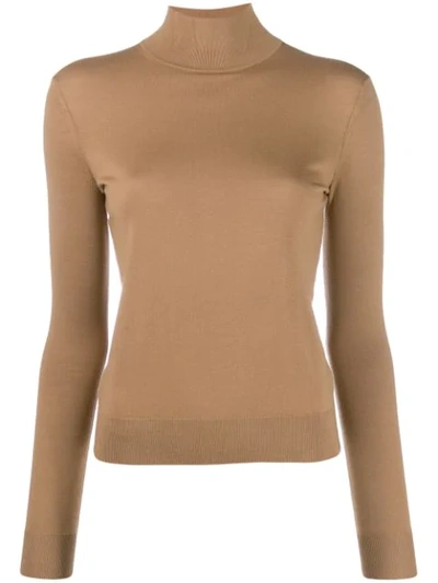 Beige wool stretch plain fitted jumper from Theory featuring a ribbed roll neck, long sleeves and a ribbed hem and cuffs.
