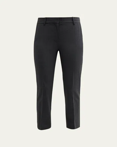 Theory "Treeca" pants in Good Wool suiting. Approx. measurements: 25 1/2" inseam; 13 1/2" leg opening; 10 1/2" front rise; 15" back rise, size 8. High rise; flat front. Side slash pockets. Rear welt pockets. Fitted through skinny legs. Cropped above ankles. Hook/zip fly; belt loops. Wool/spandex. Dry clean. Imported.