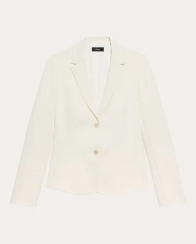 A display of Theory's suiting expertise, this admiral crepe blazer is tailored with darted seams and a streamlined waist to create flattering, feminine shape. The single-breasted silhouette is detailed with notched lapels, side pockets and inverted pleats at the back hem. Designer color: rice Button closure Single-breasted Notched lapels Darted seams Side pockets Inverted back hem pleats Admiral crepe 70% triacetate, 30% polyester Dry clean Made in Vietnam Theory Women's Admiral Crepe Tailored Blazer in White Polyester/Acetate