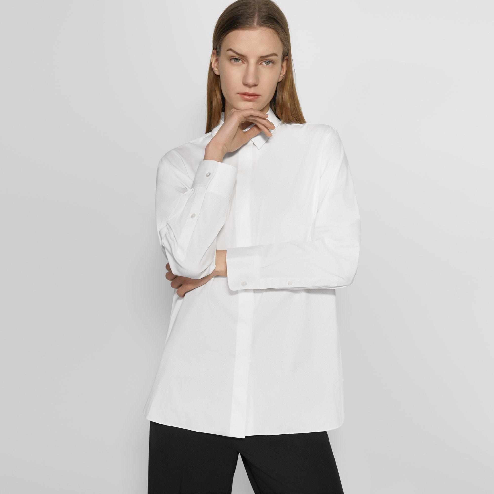 An elevated classic, this menswear-inspired shirt is cut in an oversized shape that feels cool yet sophisticated. Crafted with our stretch Good Cotton that looks crisp and keeps you comfortable year round, its concealed-button placket is hand-stitched to lay flat against the body for a clean look. Theory for Good We are committed to making a positive impact on the people who wear our clothes, our industry, and our planet, beginning with our Good fabrics. Our Good Cotton is made with extra-long staple, American-grown SUPIMA® cotton, which is recognized as one of the softest and most durable cottons in the world. To ensure this cotton is verifiably traceable, we have partnered with Oritain™, which uses forensic science to validate our SUPIMA® cotton from the farm to the mill in Italy where it is woven into cloth. Learn more about our Good Cotton.