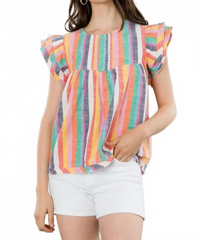 Pair this with your favorite jeans and slides for your next girls night out.Embrace the Vacation Season with the Beachfront Striped Top by THML, perfect for a bold, fashion-forward look. Crafted from 100% cotton woven fabric, this multicolor blouse features cap flutter sleeves and a back button closure, making it an easy-fit choice for summer. Its striped pattern complements the crewneck design for a casual and stylish vibe. Effortless care with machine wash and tumble dry instructions.