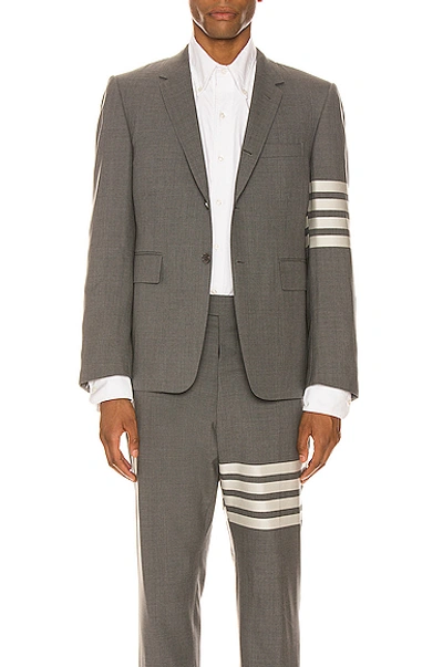 Thom Browne 4 Bar Engineered Suit Jacket in Gray Self: 100% woolLining: 100% cupro. Made in Italy. Dry clean only. Button front closures. Chest welt pocketFront flap pockets. Interior welt pocketsBack vent detail. Signature grosgrain strap interior detail. Back vent detail. TMBX-MO176. MJC001A-06146. About the designer: Thom Browne began his career designing men's bespoke clothing and expanded his line into a full ready-to-wear collection in 2004. Browne's style, rooted in a truly American sensibility and inspired by icons of the late 1950s and early 1960s, updates classic silhouettes with unexpected proportions. In 2011 he launched a women's ready-to-wear collection, and in 2012 a unisex eyewear collection. Thom was the recipient of the 2012 Smithsonian Cooper Hewitt National Design Award in Fashion Design.