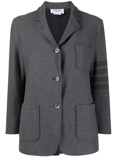 Thom Browne unstructured tailored blazer in medium gray double-face technical twill, embellished with the iconic tone-on-tone bands on the left sleeve. Single-breasted three-button closure, patch pockets, four-button cuffs with iconic tricolor grosgrain ribbon, central back vent. Tricolor grosgrain loop tab on the upper back. Straight cut, unlined. The model is 177 cm tall and wears a size IT 38. Composition: 100% cotone