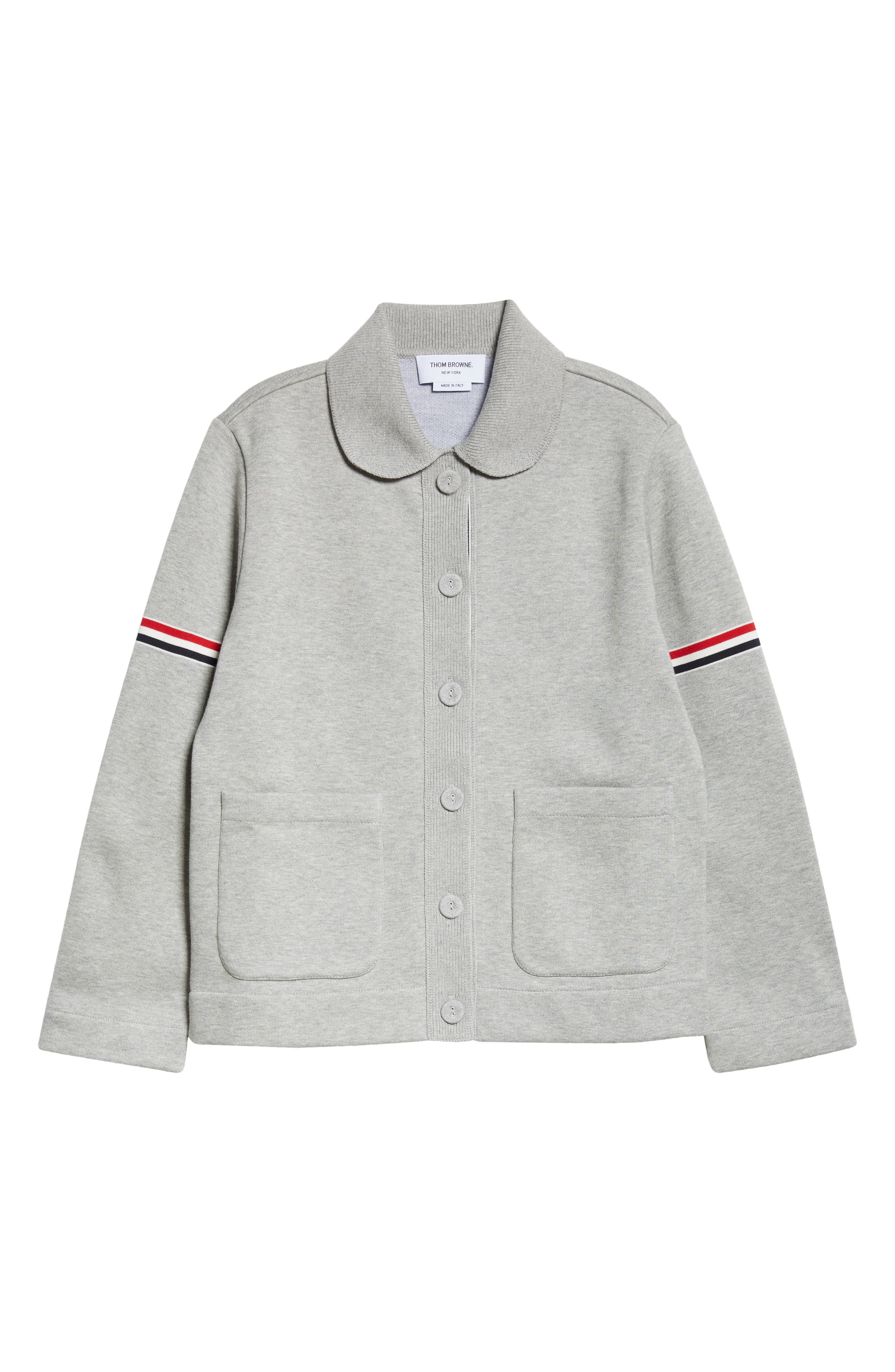 House-signature RWB stripes encircle the upper biceps of this softly heathered cotton-blend jacket given a contemporary refresh with a boxy, cropped silhouette. Front button closure Peter Pan collar Front patch pockets 98% cotton, 1% polyurethane, 1% polyamide Dry clean Made in Italy Designer Clothing