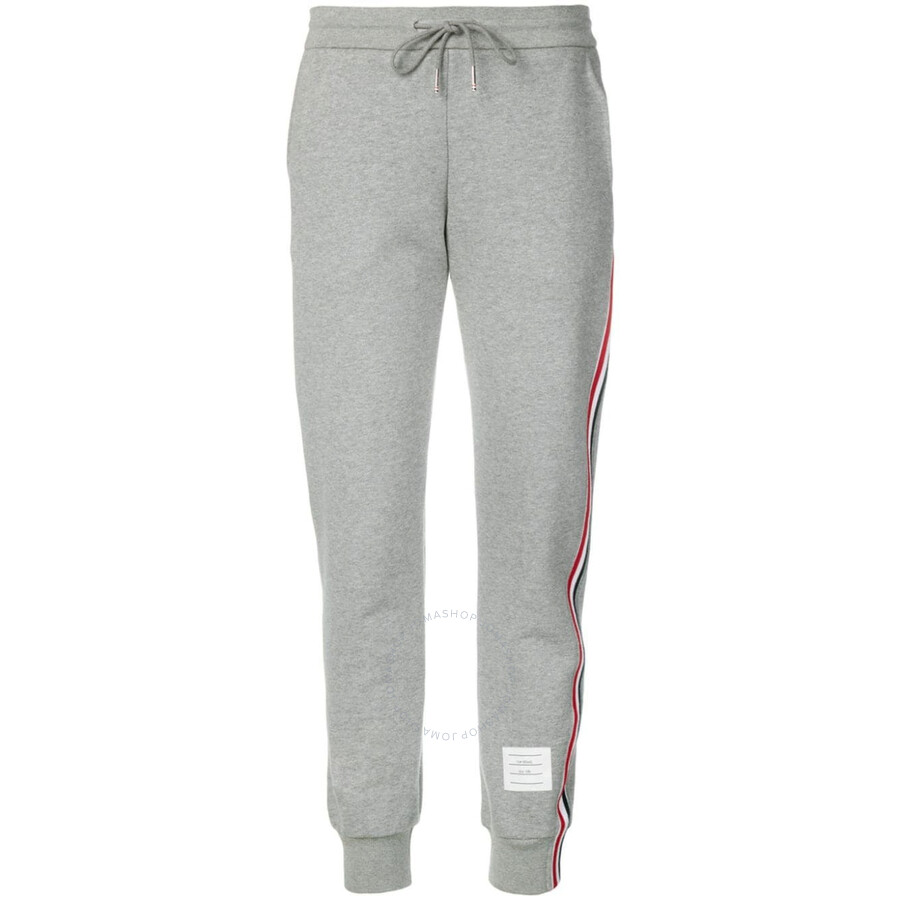 Thom Browne Ladies Bottoms. Fashion category: Pants & Leggings. SKU: FJQ024A 03377 055. Color: Lt Grey. Thom Browne Ladies Light Grey Classic Loopback Stripe Sweatpants. A pair of cotton sweatpants features drawstring waistband, slant side pockets, side stripe detail, name tag applique above left cuff, ribbed details, and finished with a Signature striped grosgrain loop tab at back waist. 100% Cotton. Made in Italy.