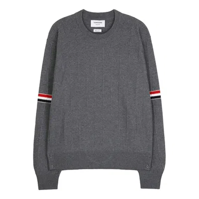 Thom Browne Mens Tops. Fashion category: Cardigans & Sweaters. SKU: MKA496A Y1002 035. Thom Browne Mens Wool Relaxed Pullover. A virgin wool pullover sweater featuring buttoned cuffs with signature striped grosgrain trim, buttoned side vents with matching trim, and buttoned striped grosgrain armbands. It also includes a signature striped grosgrain loop tab, a high crewneck, long sleeves, and ribbed trims. 100% Virgin Wool. Made in Italy.
