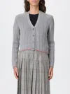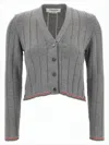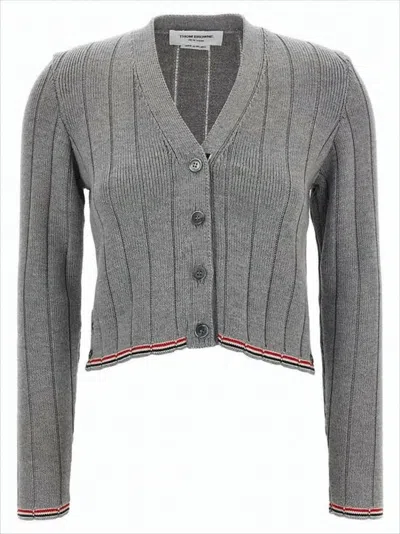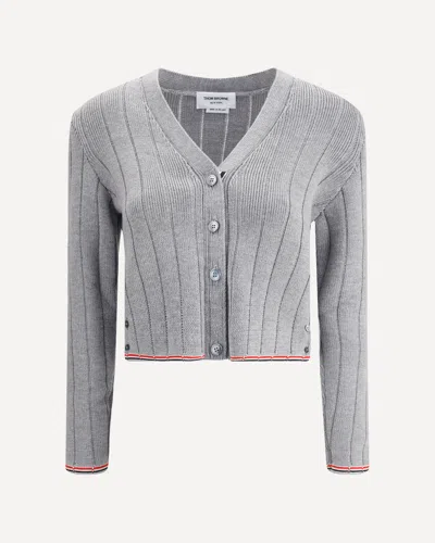 THOM BROWNE Ribbed Knit Cardigan With Cropped Silhouette And Striped Trim In Gray