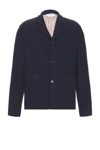 Thom Browne Sack Wool Jacket in Navy Self: 55% wool 30% silk 15% cashmere Lining: 100% cupro. Dry clean only. Single breasted closure. 3-pocket design. Buttoned cuffs. Lightweight brushed knit fabric. Item not sold as set. TMBX-MO216. MJT527A-J0217. About the designer: Thom Browne began his career designing men's bespoke clothing and expanded his line into a full ready-to-wear collection in 2004. Browne's style, rooted in a truly American sensibility and inspired by icons of the late 1950s and early 1960s, updates classic silhouettes with unexpected proportions. In 2011 he launched a women's ready-to-wear collection, and in 2012 a unisex eyewear collection. Thom was the recipient of the 2012 Smithsonian Cooper Hewitt National Design Award in Fashion Design.