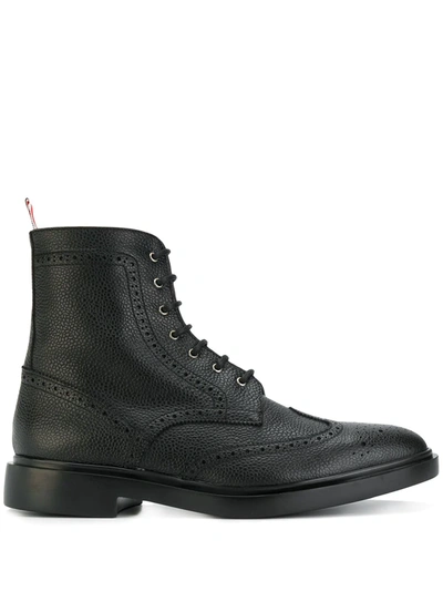 Perpetuating a timeless craftsmanship of handmade tailoring, Thom Browne's innovative garments are recognised by many museums around the world and his collections are equally esteemed everywhere. These black calf leather Wingtip ankle boots from Thom Browne feature an almond toe, a lace-up front fastening, brogue detailing, a flat rubber sole and a pull tab at the rear.