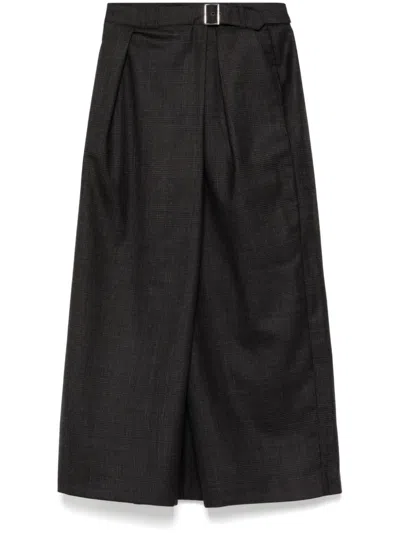 grey/black wool concealed front button and zip fastening belted waist belt loops two side slash pockets wrap design three rear welt pockets straight hem wide leg