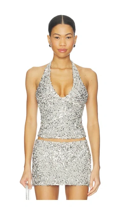 Tiger Mist Reilynn Top in Metallic Silver. - size XXS (also in L, M, S, XS) Tiger Mist Reilynn Top in Metallic Silver. - size XXS (also in L, M, S, XS) Self: 100% polyester Lining: 95% polyester, 5% elastane. Made in China. Hand wash cold. Neck tie closure. Lightweight sequin fabric. Halterneck styling. Exposed back. TMIS-WS19. TM18087. Melbourne sisters Stevie and Alana Pallister founded the Tiger Mist label in May 2013. Featuring fun, feminine styles that offer something for every wardrobe., Tiger Mist has a bold and sexy aesthetic that appeals to fashion-forward girls everywhere.