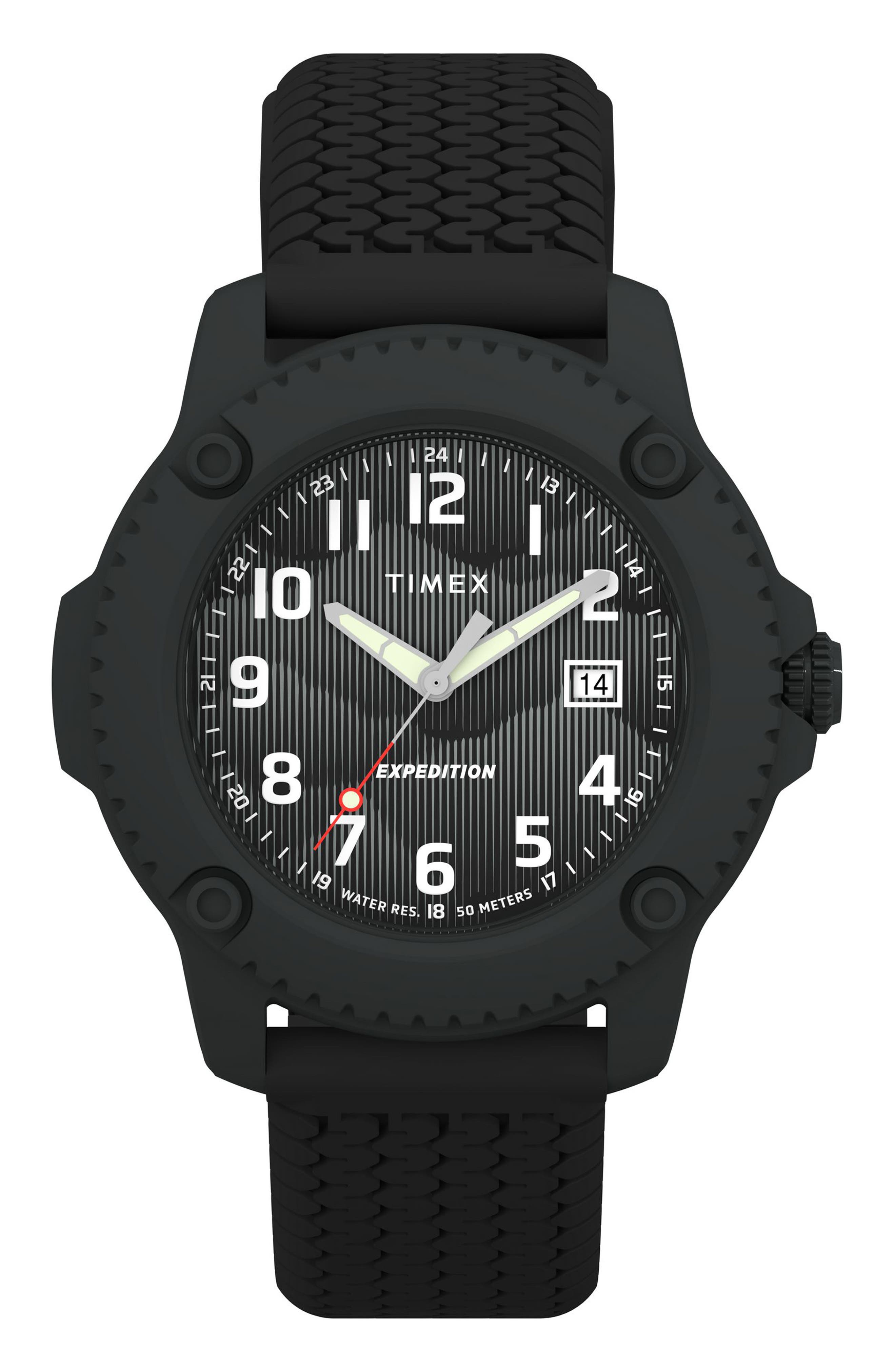 This Timberline edition of the brand's legendary Expedition line features an aluminum case and crown cover and celebrates the terrain it's named for with a monochrome mountains-in-silhouette graphic dial. It's set with a tire-tread-debossed silicone strap that celebrates the journey of getting there.Measurements: 42mm case; 11mm case depth; 20mm band width.Strap/closure: Silicone strap with adjustable buckle closure.Movement: Three-hand Japanese quartz movement. Quartz movement: powered by a battery and features an internal electrical circuit to control the rate of the watch's ticking.Complications: Date window.Other features: Graphical dial; Super-LumiNova® hands.Face: Mineral crystal face. Silicone/aluminum/stainless steel<br type="_moz"> Made in Japan