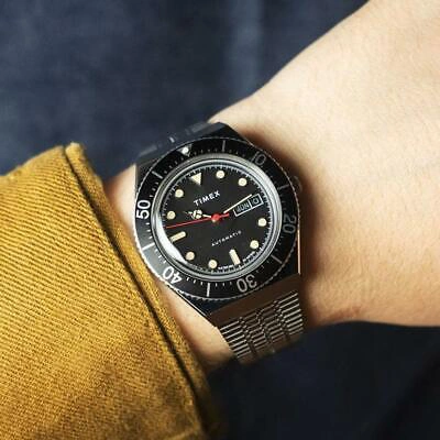 Timex M79 Automatic 40mm Silver Black Our M79 Automatic is something entirely new, even though it might look familiar. Inspired by the 1970s Q Timex and elevated with a 21-jewel mechanical movement, this watch is a fresh interpretation of a much-loved Timex icon. Powered by your movement, this automatic watch packs a 40-hour power reserve and can also be wound manually by using the crown. Featuring a black unidirectional bezel, luminous dial markings, a woven stainless-steel bracelet and exhibition case back, this modern watch captures the bold spirit of an era that changed everything. SPECIFICATIONS Case Width: 40 mm Case Material: Stainless Steel Band Color: Stainless Steel Buckle/Clasp: Clasp (Self-Adjust) Case Color: Stainless Steel Case Finish: Polished Case Shape: Round Crystal/Lens: Acrylic Dial Color: Black Dial Markings: Markers (Full) Watch Movement: Mechanical Hand-wind Water Resistance: 50 meters Top Ring Material: Stainless Steel Case Height: 14.5 mm Strap and Lug Width: 18 mm Attachment Hardware