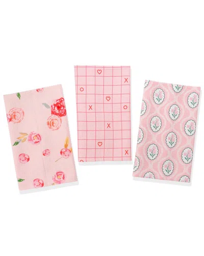 Product Description - Brighten your kitchen with playful charm and soft pink elegance. This beautifully coordinated set of three 100% cotton kitchen towels brings together floral romance and graphic sweetness-perfect for the modern homemaker with a love for delicate details.Set Includes - One towel in blush pink with hand-painted roses and leafy sprigs.One towel in a pink grid pattern with red hearts, circles, and playful "X" and "O" accents.One towel in a scalloped medallion print featuring dainty pink floral bunches on a soft blush base.Each towel measures 17" x 27" and is crafted from highly absorbent, quick-drying cotton with a waffle weave texture. Perfect for drying hands, lining breadbaskets, or adding a feminine flourish to your space.