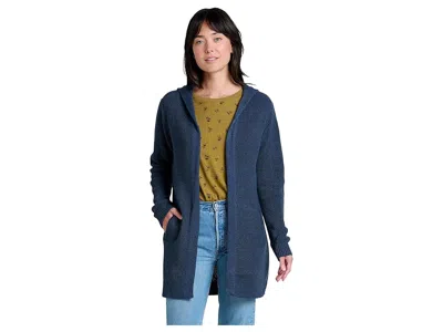 Toad&Co Moss Point Hoodie - Women's Sweatshirt : True Navy : The primary materials that compose this product contain a minimum of 20 percent recycled content. ; Effortlessly cool, eco-chic, and endlessly versatile, the ToadCo Moss Point Hoodie is where comfort meets conscious style. Designed with a relaxed hooded neck, open front, and long sleeves, this hoodie redefines layering with a polished yet laid-back feel. Woven in harmony from a heathered blend of eco-friendly threads, it's crafted to make a statement not only in style but also in sustainability. The fabric is sturdy enough to keep up with your everyday adventures, yet refined enough to wear for special occasions, offering a balance of durability and elegance. As soft on the skin as it is easy on the eyes, it delivers cozy warmth without compromising sophistication. ; bluesign certified materials. ; 60% recycled cotton, 40% recycled polyester. ; Machine washable. ; Imported. ; This product has been certified by one or more industry certifying organization for meeting at least one industry standard for sustainable and ethical products. | Toad&Co Moss Point Hoodie Women's Sweatshirt True Navy : MD, Cotton/Polyester