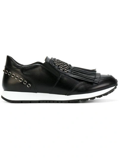 Both stylish and functional thanks to the impeccable Italian craftsmanship we've come to expect from the label, these Tod's sneakers interpret the brand's heritage in a sophisticated yet casual way. Expertly constructed from supple black leather punctuated with delicate silver-tone eyelets, this chic slip-on style boasts a round toe, a fringed flap, elasticated side inserts and a brand embossed insole. Lightly padded at the ankle and set on white rubber soles dotted with the house's famous pebbles, they're a luxurious and comfortable option for everyday wear.