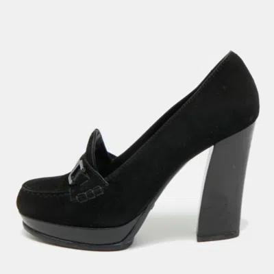 Pre-owned Size 37.5 Black Suede Block Heel Loafer Pumps