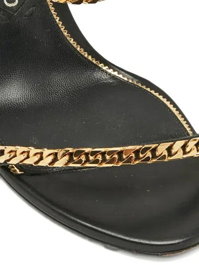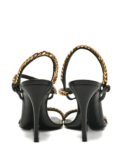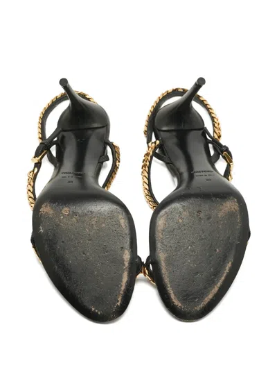 black leather chain embellishment ankle strap stiletto heel open toe This piece comes complete with a protective dust bag. Condition: GOOD. This previously owned and used item is in good condition with minimal signs of use. This may include fading of material or plating and scratches.