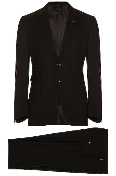 TOM FORD Plain Weave Suit in Black - Black. Size 50 (also in 46, 48, 52). Self: 100% woolLining: 50% cupro 50% silkSleeve Lining: 100% cupro. Made in Switzerland. Dry clean only. Sold as a set. Singluar front button closurePadded shoulder with buttoned cuffs. Blazer: Chest pocket, front flap pockets and interior welt pocketsTrousers: Side slip pockets and back welt pockets. Zip fly with hook and bar closureAdjustable button tab waist. Front and back po. Plain weave fabric with contrast top stitch detail. TFOF-MO10. Q22R12-21YL4C. About the designer: Tom Ford lends a contemporary elegance to all things sartorial. Raised in Santa Fe, Ford made a name for himself as creative director at Gucci, where he transformed the house of fashion into a thriving 21st century brand before going on to launch his own wildly successful label in 2005. Today, Tom Ford is coveted for everything from its statement sunglasses and fine leather accessories to its glamorous dresses and impeccably tailored suits. A Tom Ford design is an exquisite balance of timelessness and modernity.