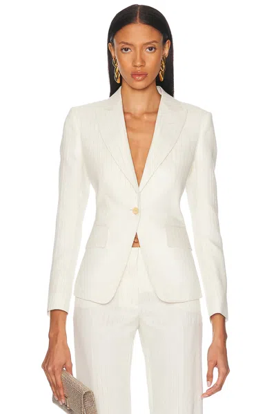 TOM FORD Single Breasted Jacket in White Self: 74% wool 24% silk 1% viscose 1% metallized fiber Lining: 59% cupro 41% silk. Made in Italy. Dry clean only. Front button closure. Padding at shoulders. Breast seam pocket and front flap pockets. Buttoned cuffs. Twill fabric with metallic silver stripe details Item not sold as a set. TFOF-WO59. GI3008-FAX1406-ZSILV. About the designer: Tom Ford lends a contemporary elegance to all things sartorial. Raised in Santa Fe, Ford made a name for himself as creative director at Gucci, where he transformed the house of fashion into a thriving 21st century brand before going on to launch his own wildly successful label in 2005. Today, Tom Ford is coveted for everything from its statement sunglasses and fine leather accessories to its glamorous dresses and impeccably tailored suits. A Tom Ford design is an exquisite balance of timelessness and modernity.