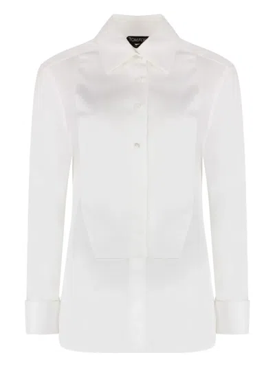 pristine white classic collar front button closure elongated front panel long sleeves double-button cuffs