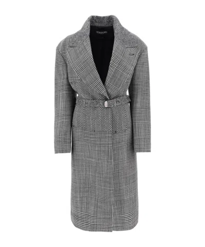 Wrap coat by Tom Ford crafted in pure cashmere with patchwork-effect panel construction and prince of Wales and herringbone patterns. It features peak lapel, side seam pockets and matching belt with logoed buckle. Lined interior. Oversized fit with calf length. The model is 177 cm tall and wears size IT 38. Composition: 100%WS