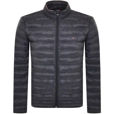 Tommy Hilfiger Core Packable Jacket In Navy. A lightweight padded jacket in navy. A full front branded zip fastening with a high collar which features a navy white and red striped trim. Elasticated cuffs on the long sleeves and an elasticated waistband which feature the signature Hilfiger logo repeated throughout in a raised rubberised black print. Two zip fastening pockets at the waist which both feature a navy white and red trim at either end of the zip track. The signature Tommy Flag logo is embroidered on the left of the chest in navy white and red. 100% Polyester.