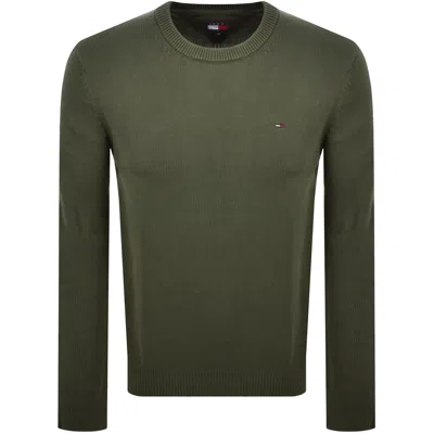 Tommy Jeans Flag Crew Neck Sweatshirt In Dark Greenery Slim Fit. A ribbed crewneck sleeve cuffs and waistband. The signature Tommy Jeans Flag logo is embroidered on the left of the chest. 100% Cotton.