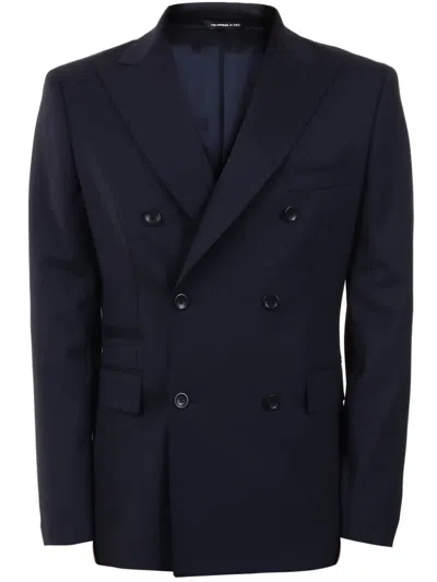 Double-breasted jacket in blue wool with side flap pockets and breast pocket. Side slits on the back.The model is 185 cm tall and wears size 48IT / L