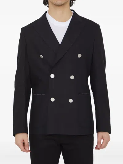 Double-breasted stretch jacket in black linen, viscose and cotton blend. It features peaked lapels, front six-button closure, two front patch pockets, a welt pocket on chest and buttoned cuffs. <br>The model is 190cm tall and wears size IT 50.<br>Gender: MenMaterial: 53% linen, 23% viscose, 23% cotton, 1% elastaneColor: BlackMade in: ITProduct ID: 30156013*Import tax/duty will be calculated at checkout (If applicable)