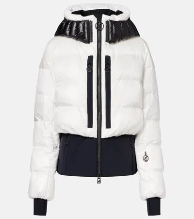 Material: 100% polyamide. Care instructions: hand wash. Made in China. Designer color name: Bright White. Item color: white. Insert: 84% polyamide, 16% elastane. Filling: 90% down, 10% feathers. Filling II: 100% polyester. Lining: 100% polyester. Closure: two-way zipped front. Pockets: zipped pockets, internal pockets. Elasticated waistband. Detachable hood. Contains non-textile parts of animal origin.