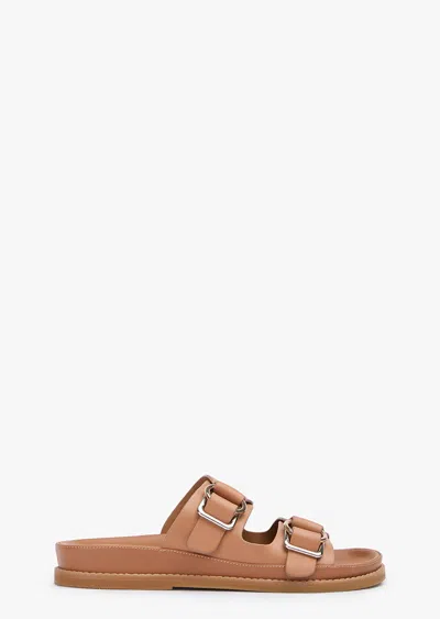 Introducing your new ride or die, Hunter . The flat slides designed for summer-time adventures, around-the-house wear or for a day full of errands - whatever your reason, Hunter has you sorted. Designed with a flat cushioned foot-bed and a thick chunky sole, alongside a round open toe and a flattering two-strap leather upper and all new leather lining . Finished with silver-toned hardware and a gold toned circular ring. - Material: ALL NEW Leather Upper & Lining - Sole: Man-Made - Fit: True to size - Toe-shape: Rounded - Features: Silver & Gold toned hardware - Heel: 3.5cm