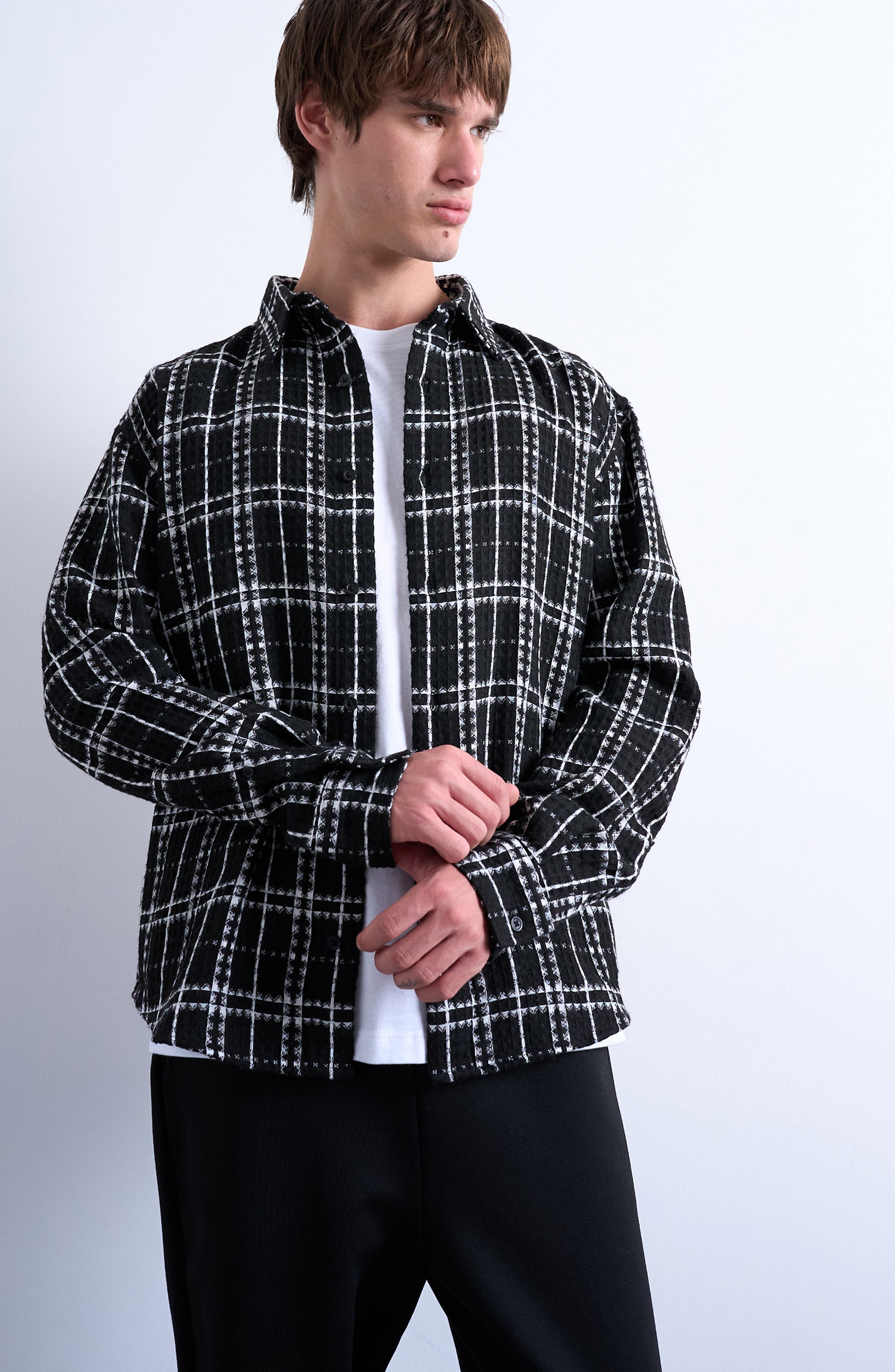 Build laid-back layered looks with this easy-fitting overshirt featuring classic checks and a textured cotton weave. Front button closure Spread collar Long sleeves with button cuffs 100% polyester Machine wash, line dry Imported