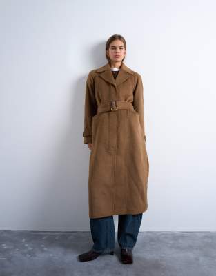 TOPSHOP Belted Formal Longline Coat With Wool In Brown