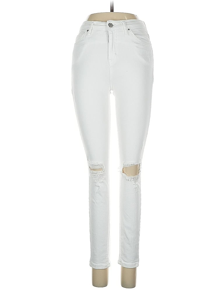 Topshop Jeans, Size: 26. Item Details: White, Metallic Pattern, Coated Wash, Skinny Leg, Cropped, Boyfriend, High Rise, Women's Bottoms, Cotton/Polyester