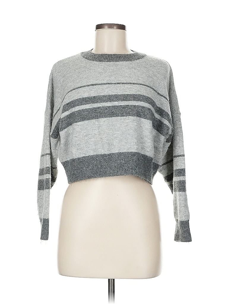Topshop Pullover Sweater, Size: 8. Item Details: Gray, Stripes Pattern, Boatneck, Long Sleeve, Women's Tops, Acrylic/Polyester/Elastane
