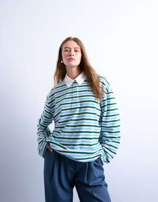 Tops by Topshop This polo shirt is crafted from soft, fine-looped towelling and features a stripe print. It has a classic collar, partial button placket, drop shoulders, long sleeves and is cut with a relaxed fit.