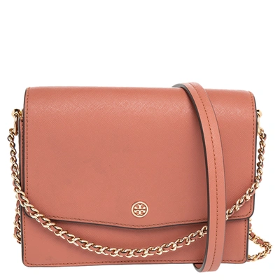 This gorgeous bag from Tory Burch will make you go head over heels with its artistic design and craftsmanship. Created from leather, it has a flap that opens to reveal a fabric compartment. The bag is complete with the brand logo on the front and a leather and chain sling.
