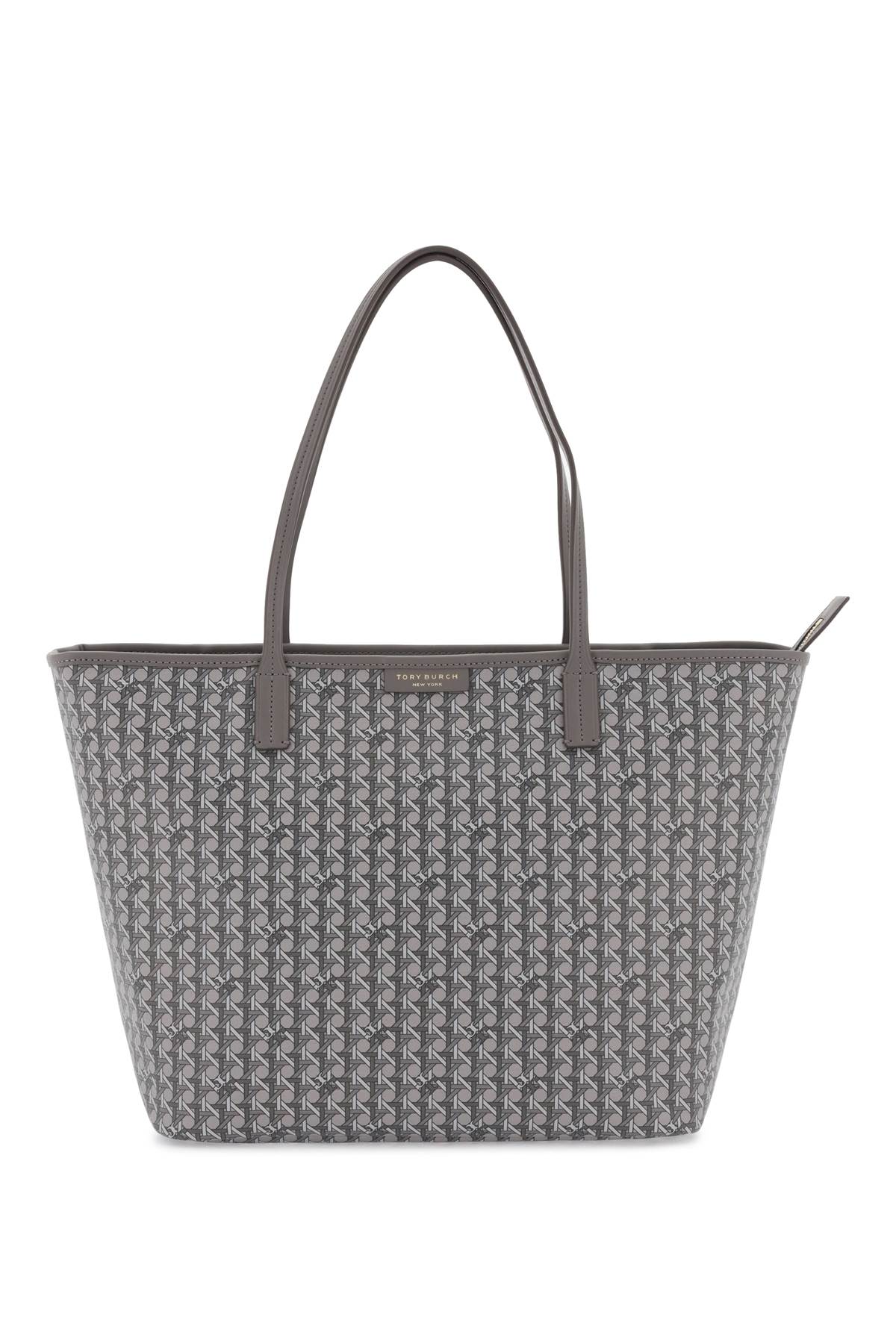 Tory Burch shopping bag made of water-repellent coated canvas, decorated with all-over monogram print. Zippered closure, inside zipper pocket, removable interior pouch. Finished with leather trims and double shoulder handle, brass details.Bag length: 32 cmBag height: 29 cmBag weight: 16 cmHandle height: 22,5 cmBrand: TORY BURCHMaterial: 100%TR, leatherSeason: Spring - SummerMade in: CambodiaSize Info: STANDARDColor: GreyWomen > Bags > Tote bags