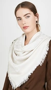 A subtle, tonal logo-jacquard pattern brings signature sophistication to a luxe scarf crafted from a rich wool-and-silk blend. 55" x 55";1" fringe 70% wool, 30% silk Dry clean Made in France