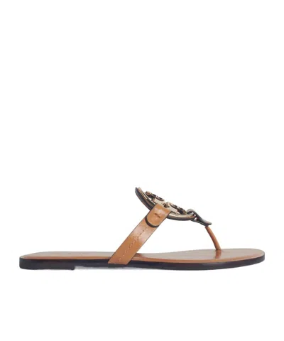 Tory Burch's Brown Leather Sandals elevate your footwear collection with sophistication. Made from premium calfskin leather, these sandals feature a unique tight fit and a striking gold metal embossed coin decoration. The smooth leather insole provides comfort, while the flexible rubber sole allows for easy movement. Ideal for both casual outings and elegant occasions, these sandals represent luxury and versatility.Specifications:- Material: 100% premium calfskin leather - Decoration: Gold metal embossed coin - Insole: Smooth leather for comfort - Sole: Flexible rubber for easy movement - Style: Versatile for casual and elegant occasions